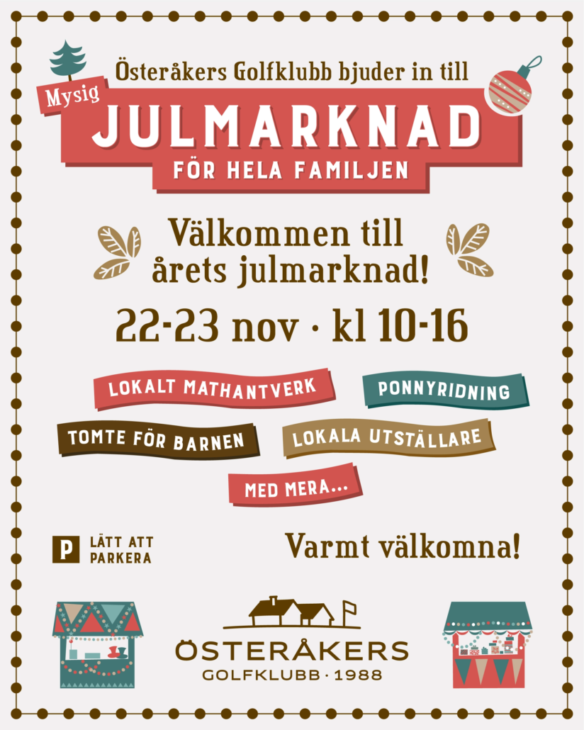 Snart tänder vi upp julen på Österåkers Golfklubb! Under november och december bjuder vi in till en mysig julmarknad för hela familjen, stämningsfulla julbord i TwoSixtyFour samt julluncher i The Lake House.