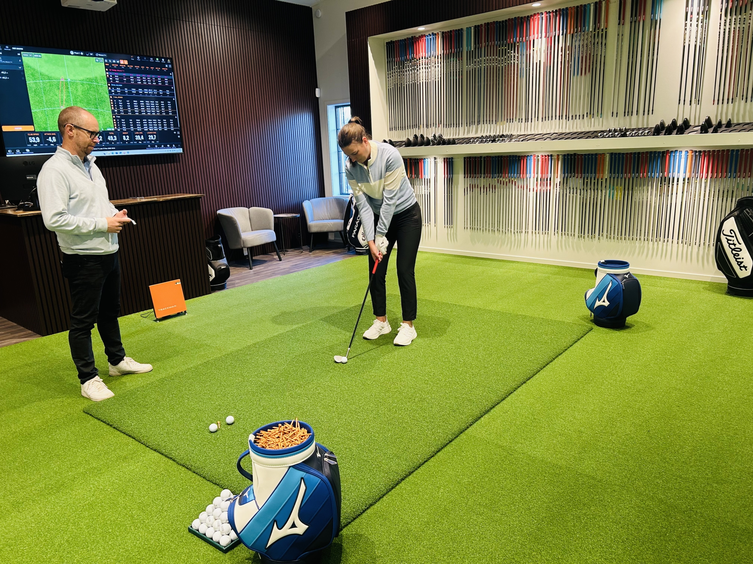 Efter vi tagit fram wedgar med rätt loft och bounce som passar för längre inspel tar vi oss ut till vår övningsgreen och bunker.